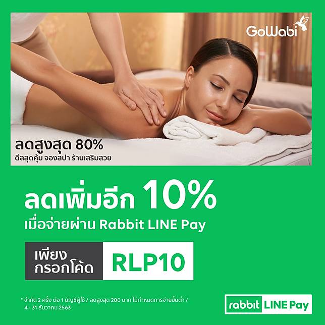 คุ้ม คุ้ม คุ้ม มากกกกกก จองดีลเสริมสวยที่ Gowabi มีโปรลดสูงสุด 80% พิเศษให้อีก ลดเพิ่ม 10%เมื่อชำระผ่าน Rabbit LINE Pay เพียงกรอกโค้ดRLP10 ว้าว ๆ ว้าวววว โปรเสริมสวย ดูแลตัวเองแบบนี้คุ้มมาก รีบซื้อดีลกันเลย ^^