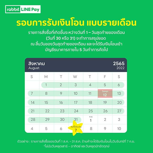 รายการสั่งซื้อที่เกิดขึ้นระหว่างวันที่ 1 – วันสุดท้ายของเดือน (วันที่ 30 หรือ 31) จะทำการสรุปยอด ณ สิ้นวันของวันสุดท้ายของเดือน และจะได้รับเงินโอนเข้าบัญชีธนาคารภายใน 5 วันทำการถัดไป (5 วันทำการ ไม่รวมวันเสาร์-อาทิตย์ หรือ วันหยุดนักขัตฤกษ์)