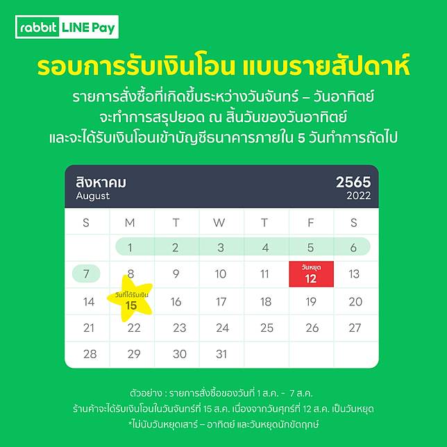 รายการสั่งซื้อที่เกิดขึ้นระหว่างวันจันทร์ – วันอาทิตย์ จะทำการสรุปยอด ณ สิ้นวันของวันอาทิตย์ และจะได้รับเงินโอนเข้าบัญชีธนาคารภายใน 5 วันทำการถัดไป