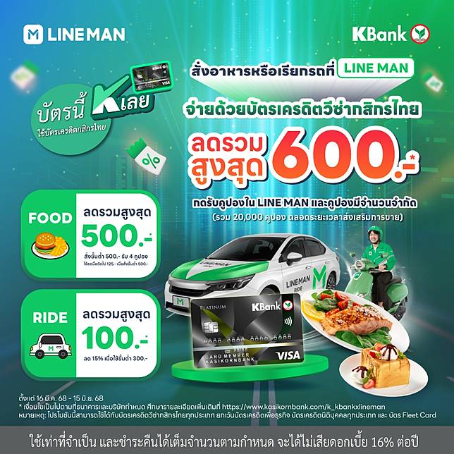 - ค่าบริการ LINE MAN Ride ขั้นต่ำ 300 บาท และชำระเงินด้วยบัตรเครดิตวีซ่ากสิกรไทย
