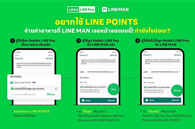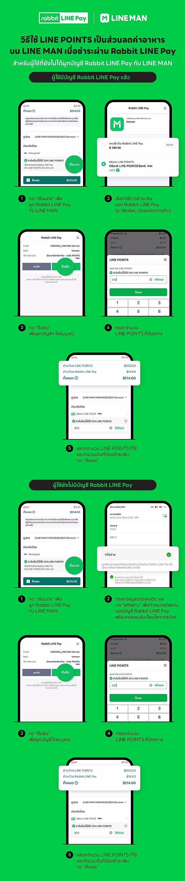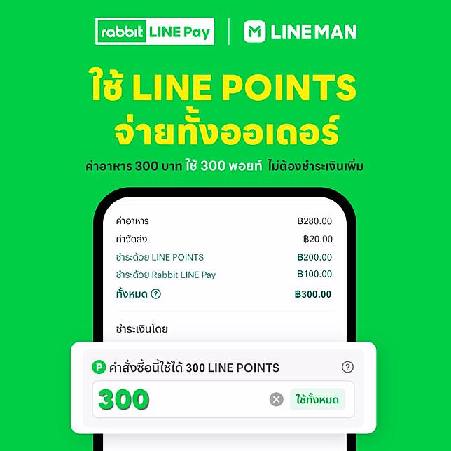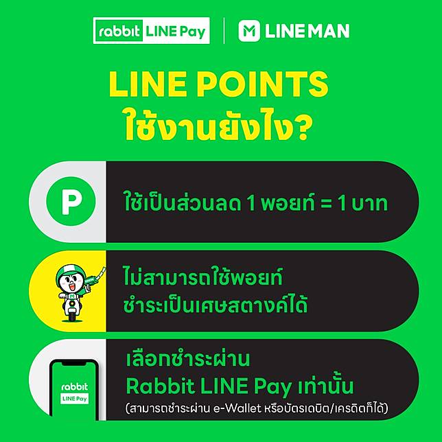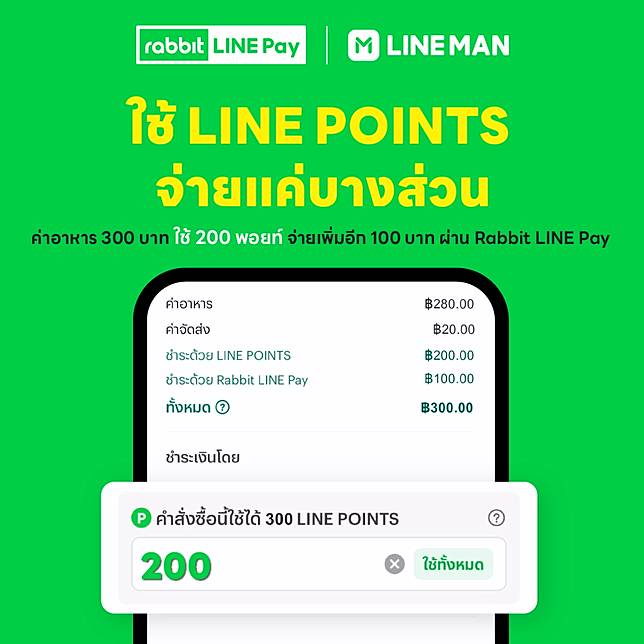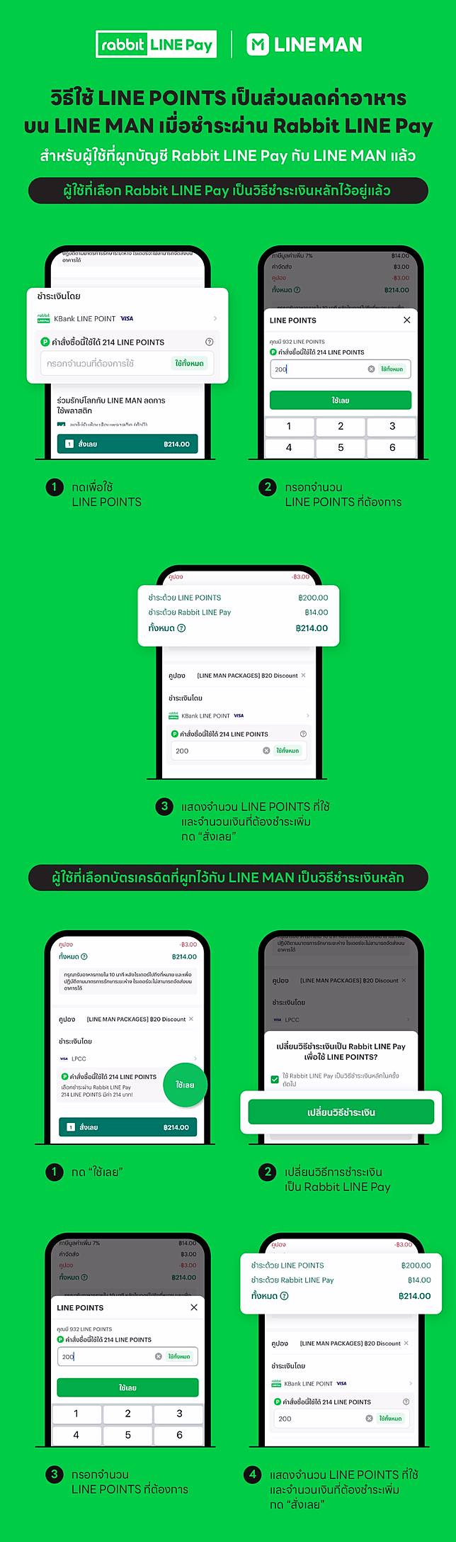 LINE POINTS ของคุณสามารถนำมาใช้เป็นส่วนลดชำระค่าอาหาร บน LINE MAN ผ่าน Rabbit LINE Pay ได้