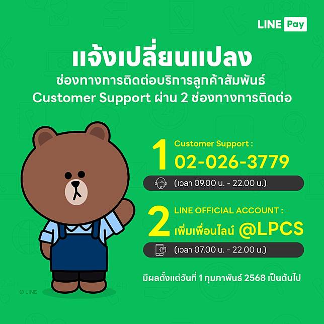 • สอบถามรายละเอียดเพิ่มเติม หรือ แจ้งปัญหาการได้รับ LINE POINTS กับเจ้าหน้าที่ LINE Pay ได้ทางโทรศัพท์ที่เบอร์ 02-026-3779 เวลา 9.00 – 22.00 น. หรือผ่านช่องทาง LINE OA: @lpcs เวลา 7.00 – 22.00 น. และสอบถามรายละเอียดเกี่ยวกับการใช้บัตรเครดิต ได้ที่ K-Contact Center 02-8888888