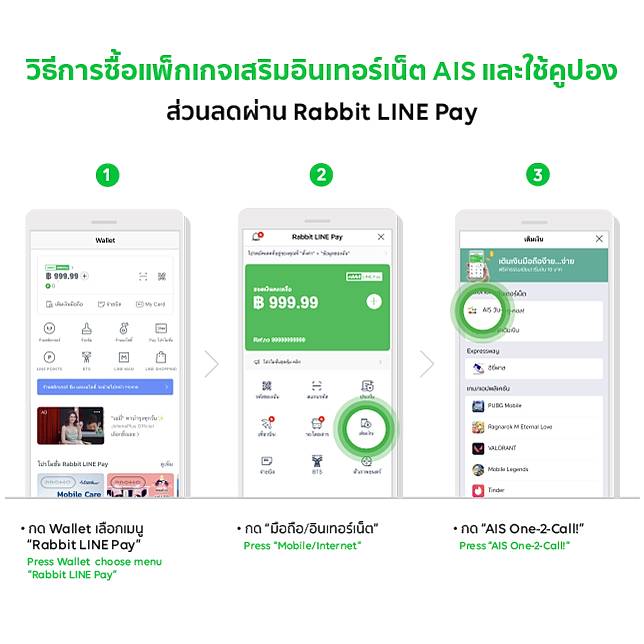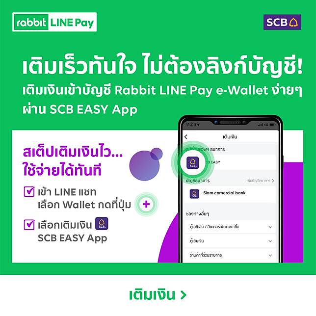 โปรโมชั่น! ซื้อแพ็กเสริมเน็ตเอไอเอส ผ่าน Rabbit LINE Pay รับส่วนลดรวม 100.-* คลิกซื้อแพ็กที่ต้องการ" data-width="644" data-height="100">โปรโมชั่น! ซื้อแพ็กเสริมเน็ตเอไอเอส ผ่าน Rabbit LINE Pay รับส่วนลดรวม 100.-* คลิกซื้อแพ็กที่ต้องการหากมีคูปองส่วนลด ระบบจะแสดงโดยอัติโนมัติเมื่อซื้อแพ็กเสริมเน็ตผ่าน Rabbit LINE Pay" data-width="645" data-height="645">หากมีคูปองส่วนลด ระบบจะแสดงโดยอัติโนมัติเมื่อซื้อแพ็กเสริมเน็ตผ่าน Rabbit LINE Payสมัครแรบบิท ไลน์ เพย์ เพียงมีประชาชน ทำตามขั้นตอนผ่านระบบสามารถใช้งานได้ทันที" data-width="644" data-height="200">สมัครแรบบิท ไลน์ เพย์ เพียงมีประชาชน ทำตามขั้นตอนผ่านระบบสามารถใช้งานได้ทันทีสิทธิพิเศษลูกค้าที่มีแอปฯ SCB Easy App สามารถเติมเงินเข้ากระเป๋า e-Wallet ได้ไม่ต้องสลับแอป หรือ ดูวิธีการเติมเงิน