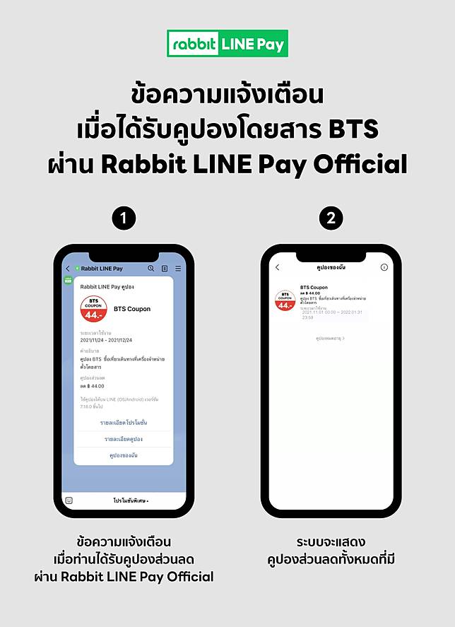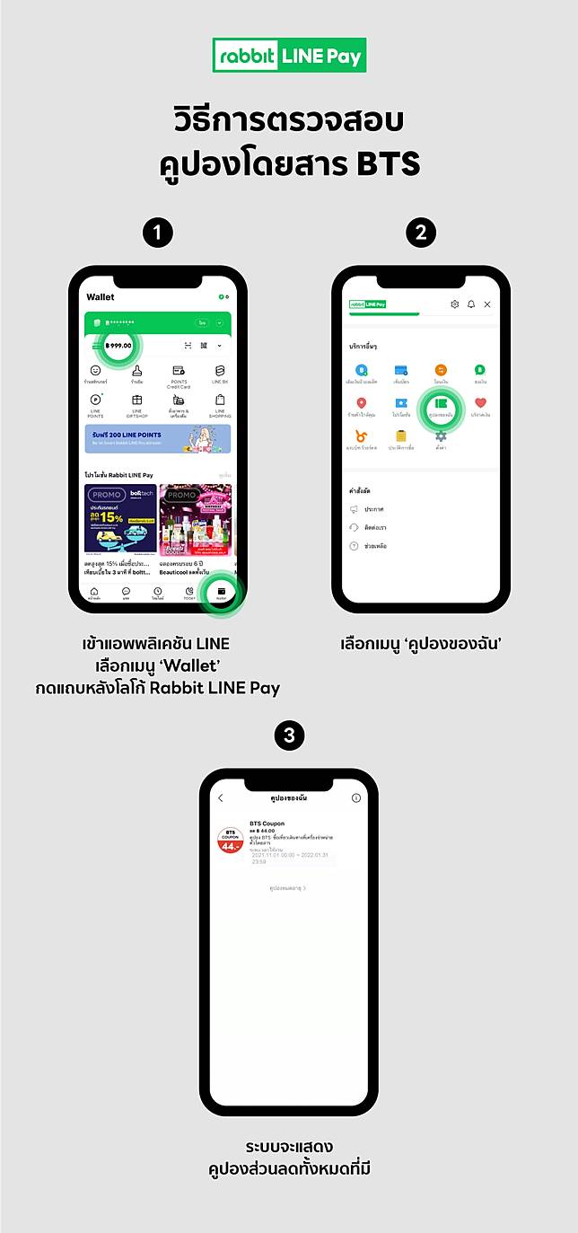 • คูปองโดยสารบีทีเอส มูลค่า 44 บาท สามารถใช้เพื่อเป็นส่วนลดการชำระเงินเพื่อซื้อบัตรโดยสารบีทีเอสแบบเที่ยวเดียว ที่ตู้จำหน่ายตั๋วอัตโนมัติแบบเลือกชำระด้วย QR Code ผ่าน Rabbit LINE Pay เท่านั้น