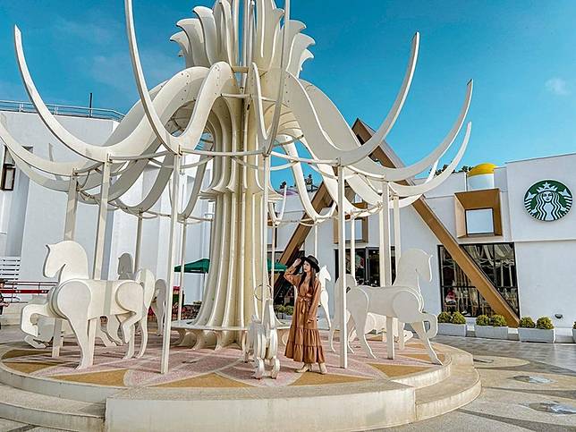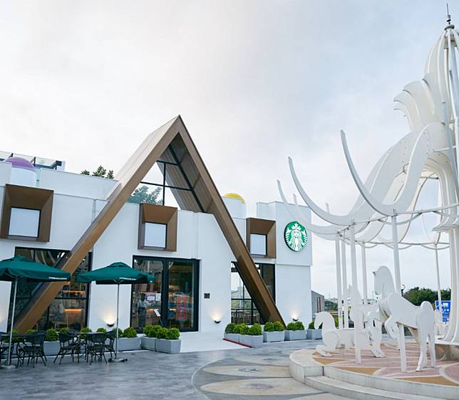 坐落於國道1號泰安休息站內的星巴克泰安南門市,建築風格主體以「幸福驛站」為主軸,並以積木城堡為設計概念,給人童話城堡般夢幻感,而泰安南門市前的純白色旋轉木馬更是網美們的打卡熱點,為原本平凡的休息站帶來童趣與浪漫的氛圍。