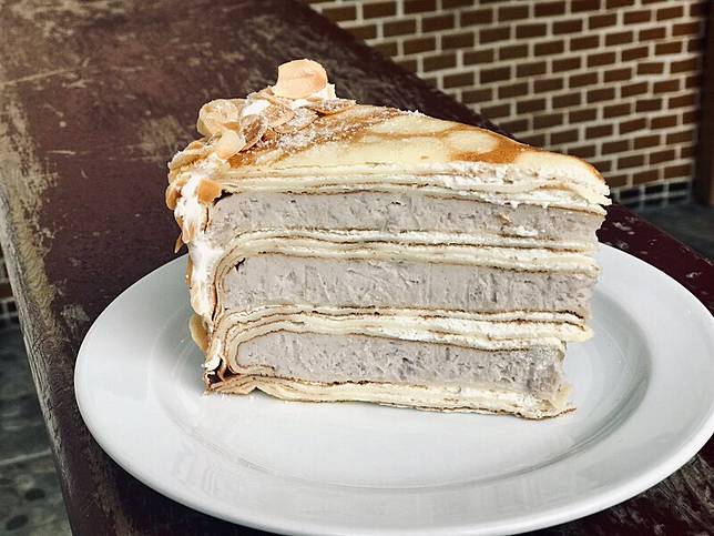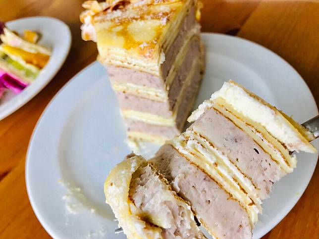 使用新鮮芋頭蒸熟後製作成芋泥餡,芋泥千層蛋糕滿滿3層厚實的芋泥餡~