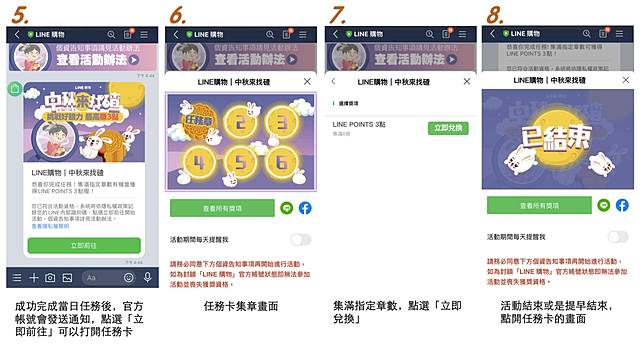 4. 活動期間6日內集滿6個章,點選任務卡「查看所有獎項」後,點選「立即兌換」,即可獲得LINE POINTS 3點,限額10,000名。