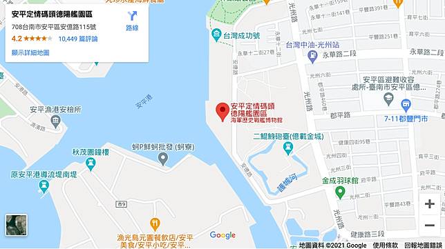 全台唯一的軍艦博物館,以「德陽艦」為主角的軍艦博物館,霸氣船身造型成為台南知名拍照景點。登鑑後可以四處走走參觀裡頭的軍艦構造,其中最吸引人的當然還是走上甲板,欣賞那優美的夕陽景色跟安平港湛藍的海景。