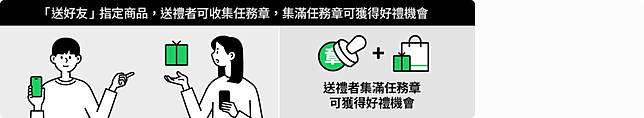 活動期間,使用LINE禮物「送好友」活動指定商品,送禮者(即購買者)即可獲得1個任務章,單一LINE帳號每天最多可集1個章,集滿2/3/5個印章後,即有機會分別兌換對應獎勵,獎勵有限,兌完即止。