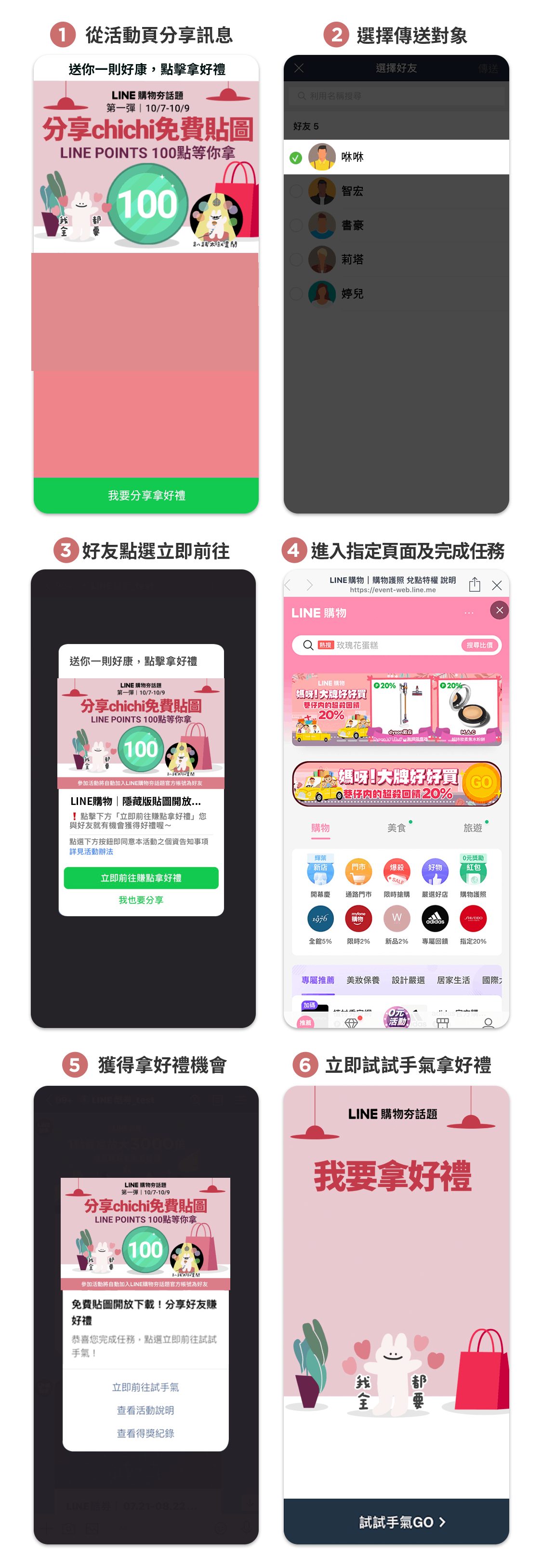 歡慶免費貼圖開放下載! LINE購物夯話題要送你驚喜好禮囉~於活動期間透過活動頁將訊息分享給親朋好友,每成功推薦一位好友以LINE帳號成功進入指定活動頁,您與被推薦的朋友即可獲得好禮,成功推薦2位即可獲得2次好禮,以此類推,活動期間每一LINE帳號最高可獲得10次好禮喔~馬上分享給親朋好友一起來賺好禮吧!