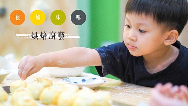嗅覺和味覺是人類與生俱來的能力,早在媽媽肚子裡的時候,胎兒就已經有味覺囉!課程透過食材的氣味、顏色、觸感等接觸,擴充孩子對食物的認知;經由秤重、桿麵團等料理步驟,訓練孩子數理概念及手眼協調能力。
