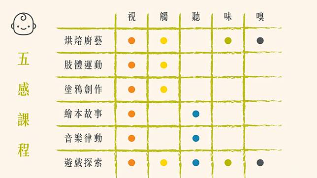 視覺、聽覺、味覺、嗅覺、觸覺,俗稱「五感」;0 ~ 3 歲的幼兒,運用五感探索環境,開啟認識世界的第一步;擁有具體感官認知的 3 ~ 6 歲孩子,則可透過「五感」遊戲刺激、開發課程,一來可豐富孩子的大腦學習,二來可進階培養孩子的創意、專注、情緒穩定、問題解決等能力。