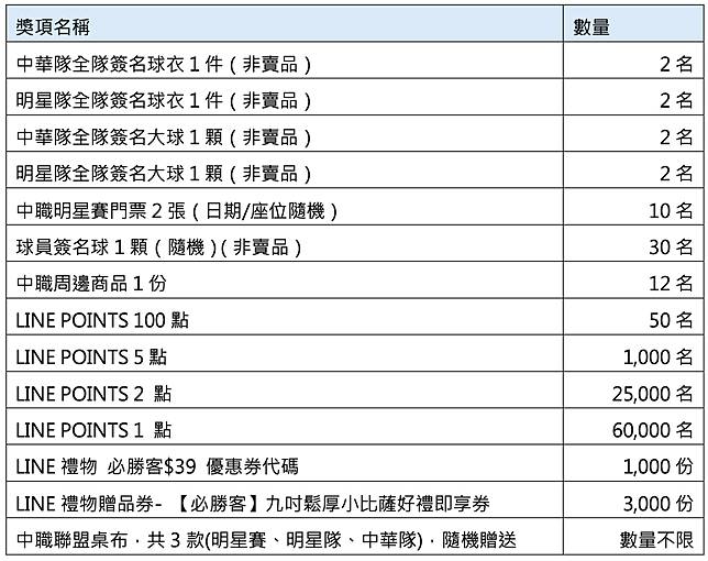 *「中華隊全隊簽名球衣、明星隊全隊簽名球衣、中華隊全隊簽名大球、明星隊全隊簽名大球、中職明星賽門票、球員簽名球、中職周邊商品」另需符合「於規範時間內參與活動並回傳領獎表單」之條件