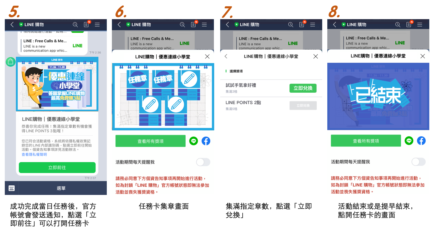 3. 獎勵全數兌換完畢後,活動即會提前結束,無法再集章或領取獎項,隔日將公告於活動辦法及推播於「LINE 購物」官方帳號。