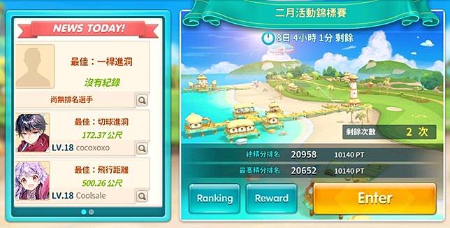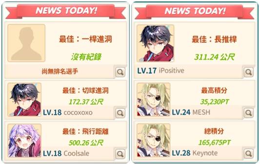 除了總積分跟最高積分排名之外,在錦標賽主畫面的左側,可以看到當天最佳玩家的紀錄,像是一桿進洞、切球進洞最遠距離、最遠飛行距離、最遠長推桿、最高積分跟最高總積分的即時記錄。