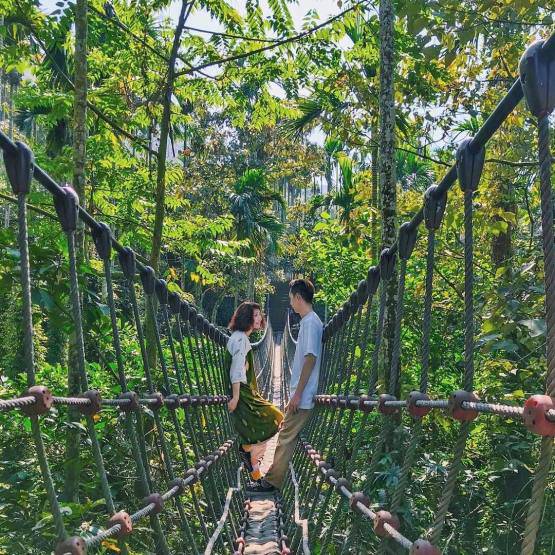 高矮不一的叢林樹木環繞於四周,繩索製成的情人橋限載兩人,走在搖晃狹窄的橋上像在山林冒險般刺激緊張,卻也格外浪漫。