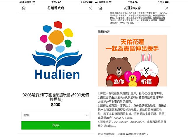 2.捐款金額由LINE Pay代收並轉付花蓮縣政府震災專户,LINE Pay不收取交易手續費。