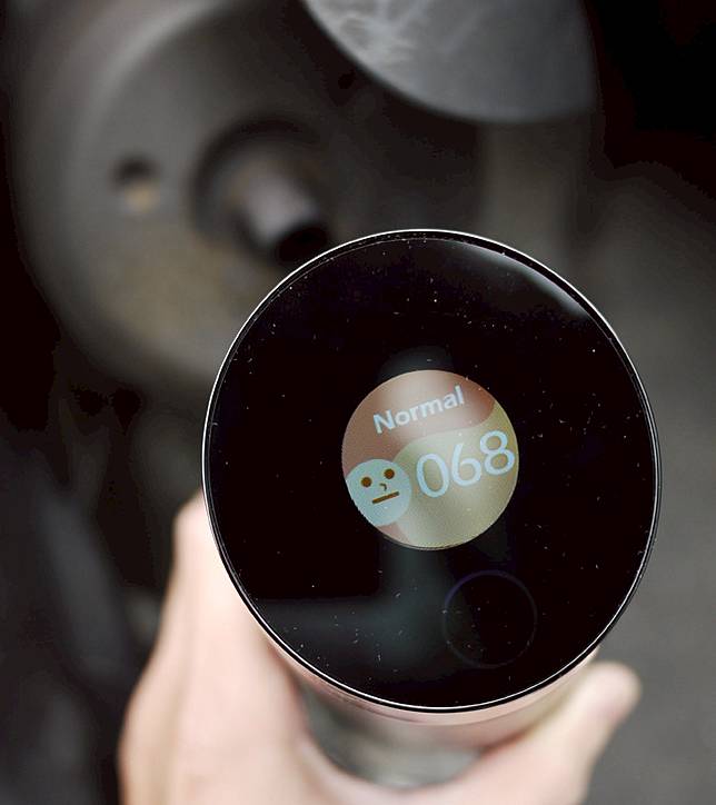 登楞!直接放到摩托車排氣管出口處,數值馬上就直線上升,顯示幕顏色變成了黃色的Normal,看得出來機器內部的空氣品質檢測機能,是真的有在運作。