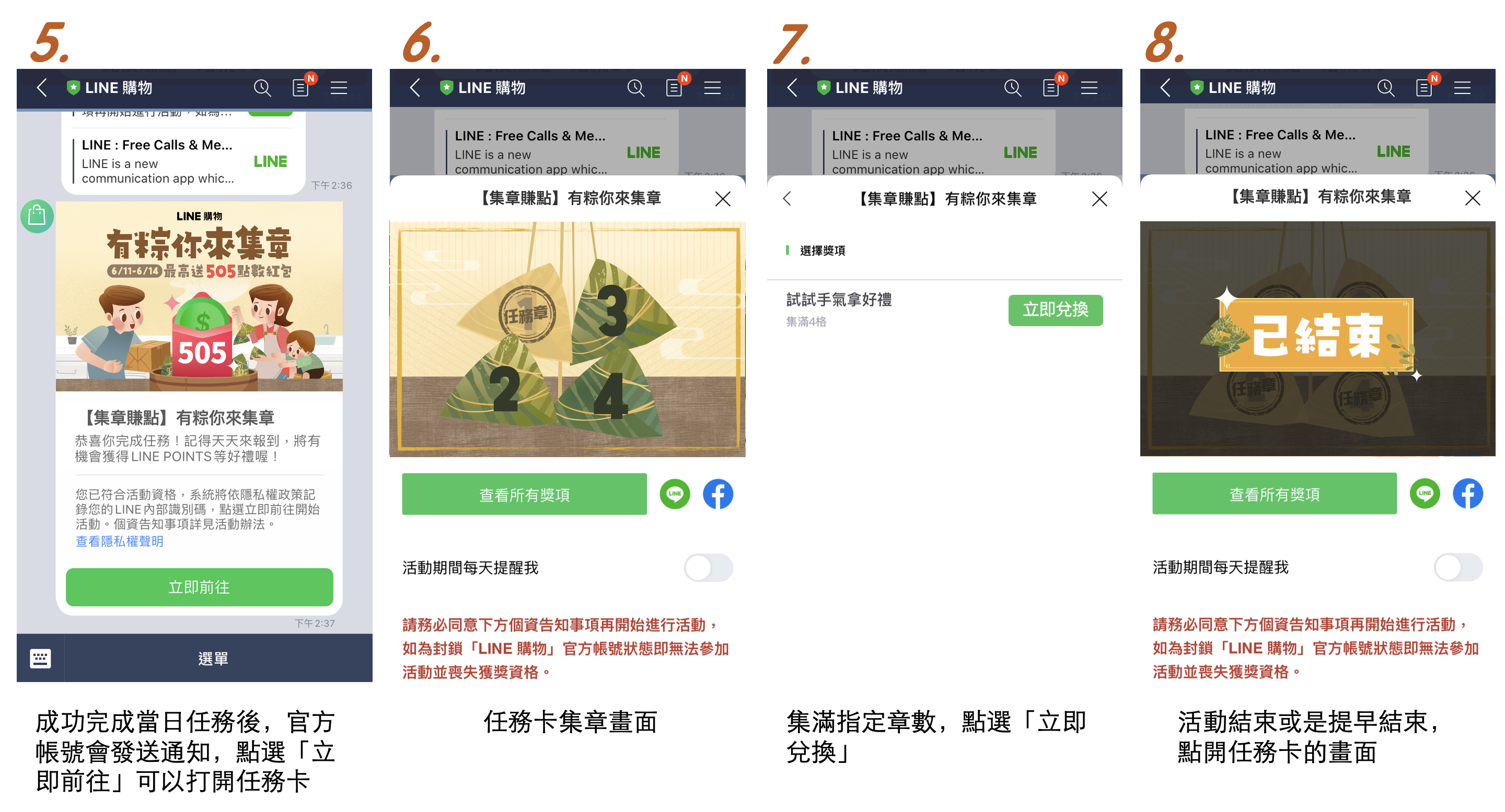 3. 獎勵全數兌換完畢後,活動即會提前結束,無法再集章或領取獎項,隔日將公告於活動辦法及推播於「LINE 購物」官方帳號。