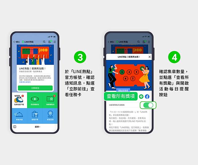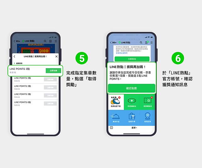 (三):於「LINE 熱點」官方帳號,確認通知訊息,點選「立即前往」查看任務卡,並點選「查看所有獎項」與按下「立即兌換」才能成功得點。共計375,000份獎項,名額有限,兌完為止。
