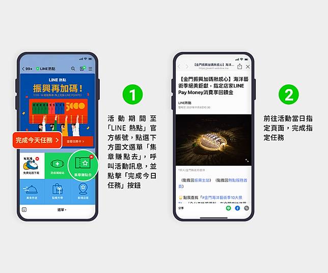 現在只要在「LINE熱點」官方帳號上,點擊振興活動推播圖文訊息或下方選單「集章賺點去」按鈕,呼叫活動訊息,到達指定頁面,完成指定任務,即可獲得任務章!