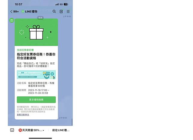 1. 若您沒收到「指定好友票券任務」活動通知(如下圖),將不符合活動參與資格。