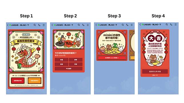 於「籤程似錦旺龍年」活動期間(以下稱「本活動」)至「LINE台灣-再LINE 一下」官方帳號,點選「點我開始求籤」,即可進行聊天室互動活動。