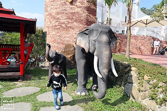 館內還有一大亮點,居然可以看到仿真大象雕塑,不仔細看還以為是真的大象在草地上走動,也由於是造景藝術,想要近距離接觸、擺動作都沒問題。