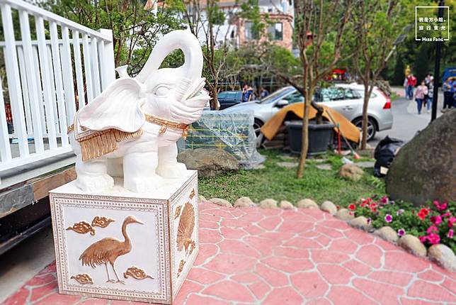 會館前面就有尊金色輝煌的立體佛像,涼亭前還有泰國祥瑞五靈之一的小白象,涼亭更是仿造泰國寺廟去打造,讓人覺得彷彿一秒飛到泰國!一旁綠意盎然的景色和碧藍天空相互輝映,在這喝喝下午茶、散散步、拍拍照,把煩惱拋到九霄雲外。
