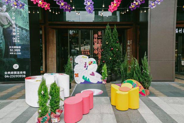 帶你直接走進CHOU YI的開心地圖!金典綠園道將CHOU YI獨特繽紛色彩與歡樂感帶到了現實場景,筆下人物與元素色彩化為1F戶外廣場公共座椅,並利用場地空間與自然風,將主視覺配色與場域特色融合,結合風車與串燈,讓大家抬頭就能看見「花海」,營造出童趣的聖誕節感。