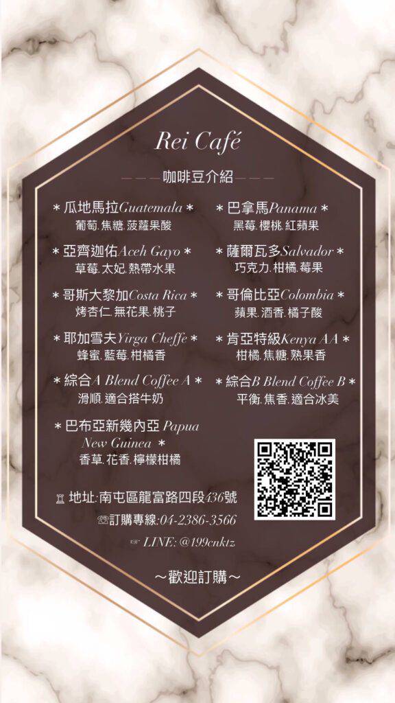 Rei café位在南屯區龍富路四段,隱身於單元二的新開發住宅區之中,靠近孩子們超愛的黎新公園(李科永紀念圖書館),對面是哈雷的旗艦展示中心,店面招牌並不顯眼容易被路樹遮住,在網路上的資訊也很少,但去過一次後就會愛上他,店內的客人多為常客,沒有知名行銷,靠口碑也能夠站穩市場!!