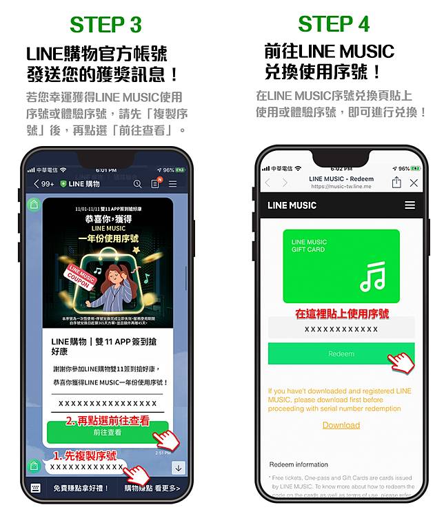 i. 獲獎者將收到「LINE購物」官方帳號傳送之LINE MUSIC使用序號獲獎訊息,複製訊息中的序號後,即可前往LINE MUSIC頁面兌換。