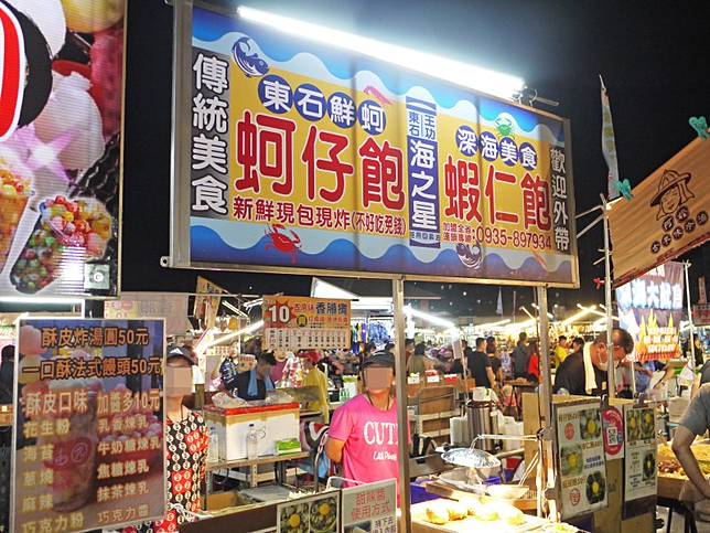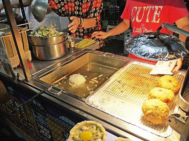 強調新鮮海產現包現炸、不使用回鍋油。經三年才開發完成的薄皮,裡面裝滿當天從市場採買的食材:高麗菜、韭菜、冬粉、一整顆的蛋,及至少六顆的東石深海鮮蚵。
