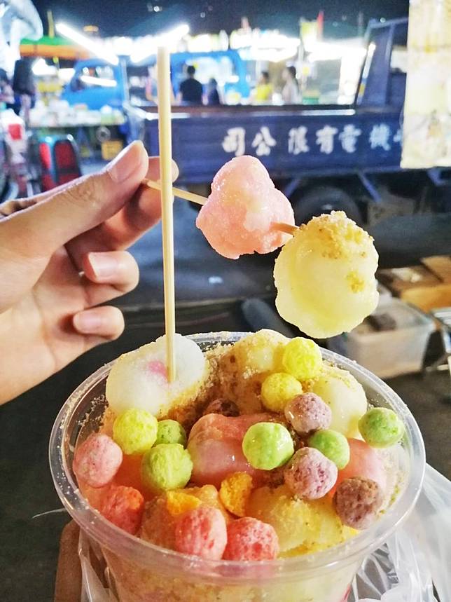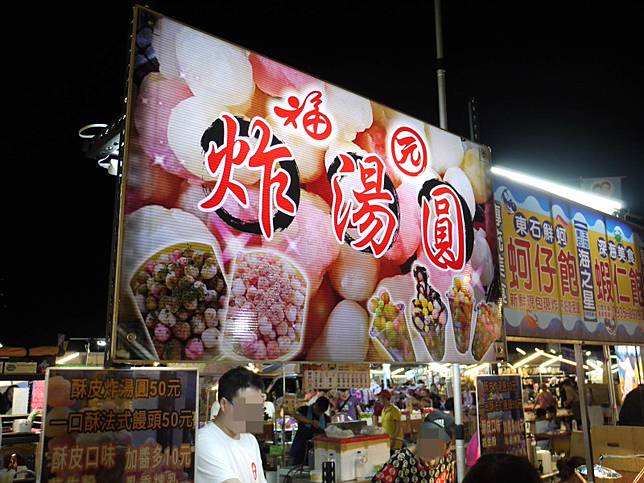 【福圓炸湯圓】將鄉下的喜宴美食改頭換面,湯圓加上獨門秘方,炸至脆皮,添加麻辣、蔥燒、海苔等特殊調味粉蹦出新滋味。可以看見不少逛夜市的人,手中都拿著這樣杯裝的彩色小零食,邊走邊品嘗這項小點心。