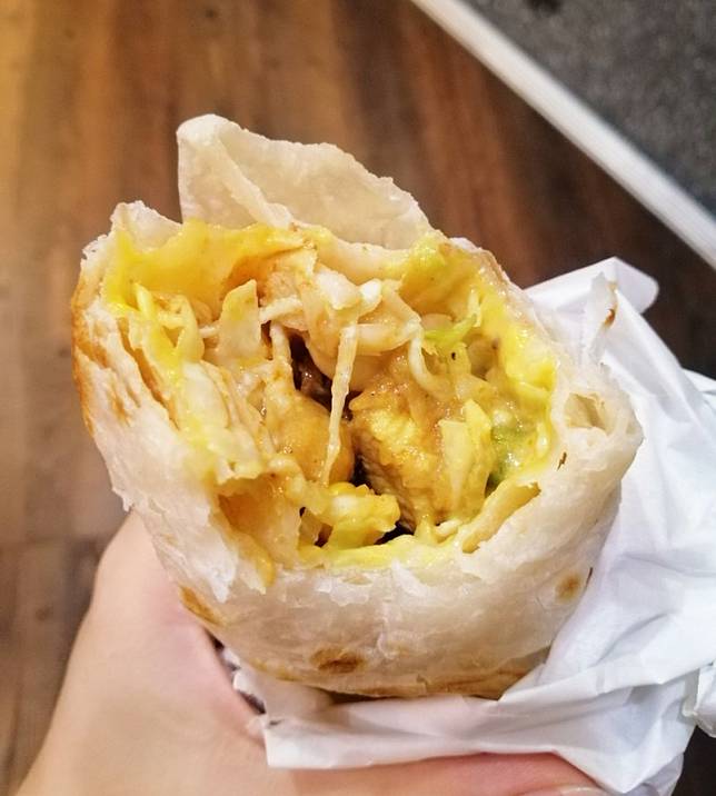 【印度阿三甩餅】提供的口味有甜有鹹,甜的熱銷品項是巧克力、煉乳、蜂蜜;鹹的招牌就屬「雞肉咖哩起司」。咖哩裏頭有高麗菜絲、紅蘿蔔、青豆、馬鈴薯,濕潤的醬料酸甜酸甜,不會有過重的香料味;現擀的餅皮嚼在口裡,帶有麵粉的清