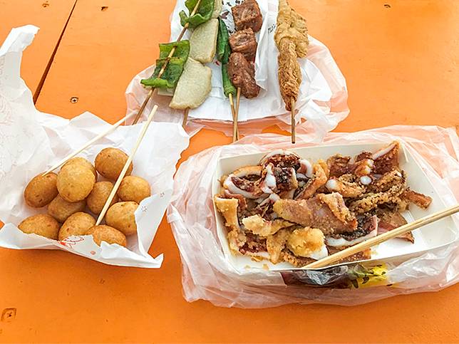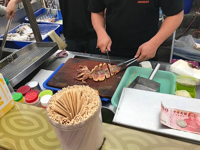 乍看之下這家店的價格需要用到百元鈔票,似乎不算是高CP值的店家,但對筆者來說,這家店卻是最推薦的一家,原因有三個:好吃、好吃、還是好吃。筆者一向對魷魚缺乏好感,口感很韌不說,還有種邪惡的海產腥味,但這家魷魚船是真的厲害,它們家的魷魚外脆內Q還散發著陣陣香氣。