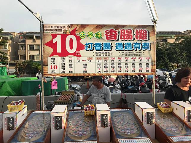 這是非常古早味的打彈珠換香腸活動,騎著一輛三輪車,一邊烤香腸一邊讓小朋友打彈珠的畫面深植在許多人的童年回憶中。店家採用的並非新式電子彈珠台,而是懷舊的彈簧手動彈珠台,這樣的彈珠台相當需要技巧與力道的控制,蠻幹般的打法是無法獲得獎勵的,然而筆者剛好只會用蠻力打彈珠,所以成功獲得了安慰獎糖果一顆。