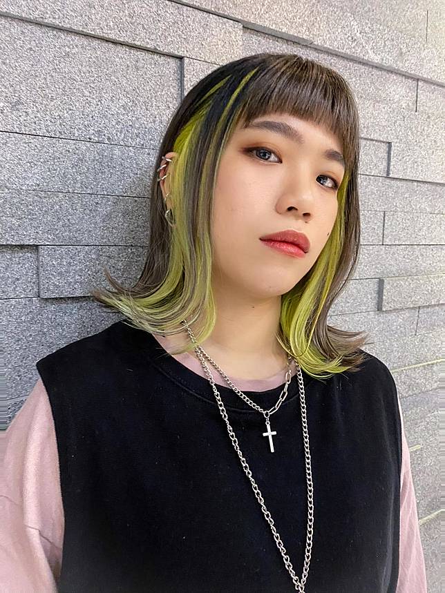螢光青草綠這麼容易失手的高調色,在這款質感髮型上卻顯得時尚迷人,原因就在於底色搭配的亞麻棕以及設計師巧思挑染手法