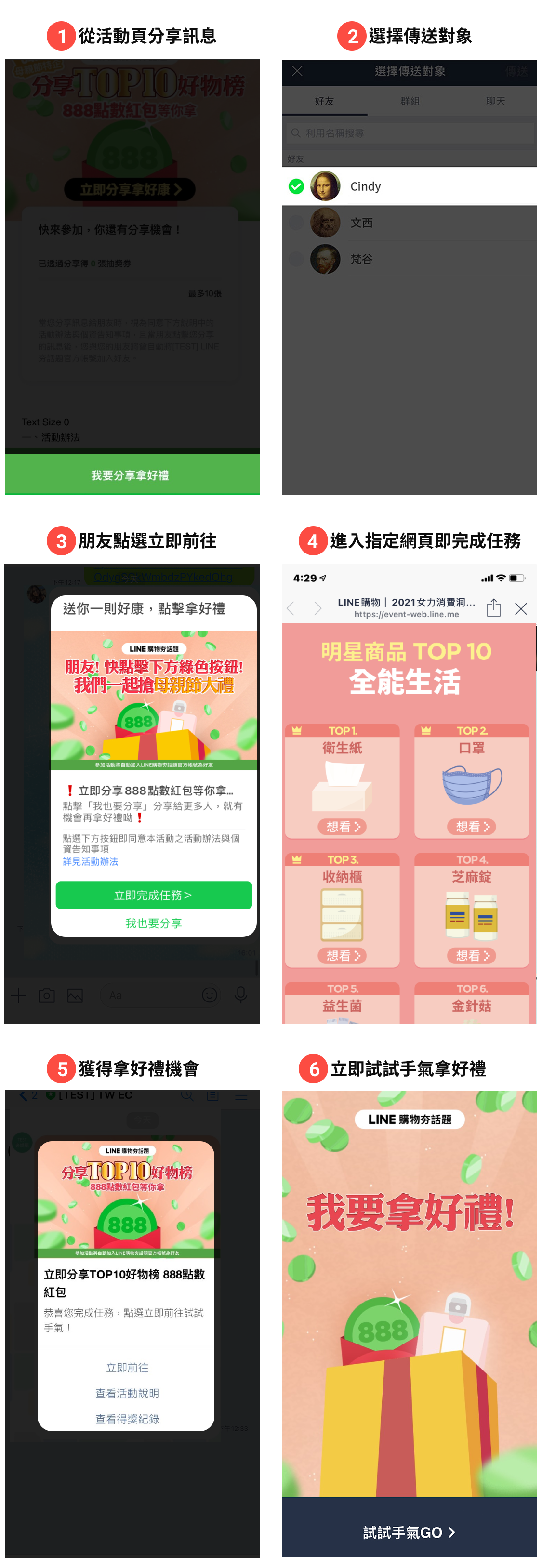 5. 分享給同1名好友,最高可獲得1次好禮,若要再獲得好禮請分享給其他好友。