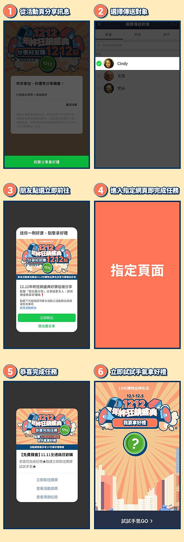 6. 此活動期間為2021年12月1日(三)00:00 ~ 2021年12月5日(日)23:59,請在此活動期間內完成分享,而收到好禮之用戶,亦須於2021年12月5日(日)23:59前點擊訊息網址。逾期未完成分享或兌換者,視同放棄並自動取消資格。