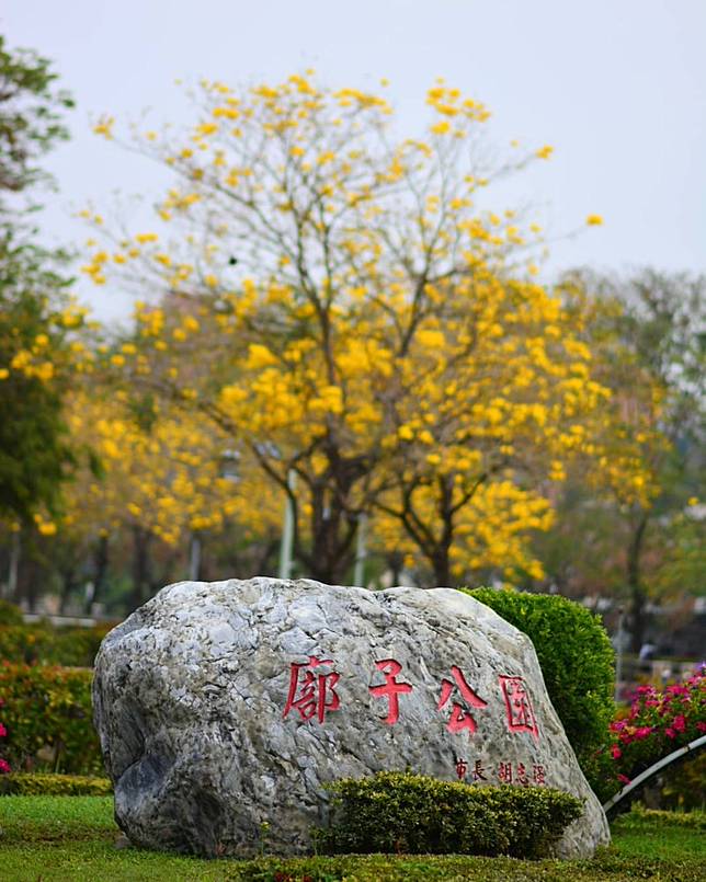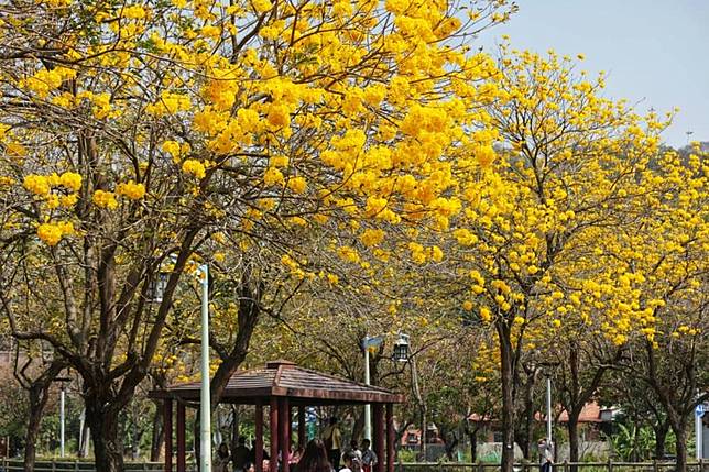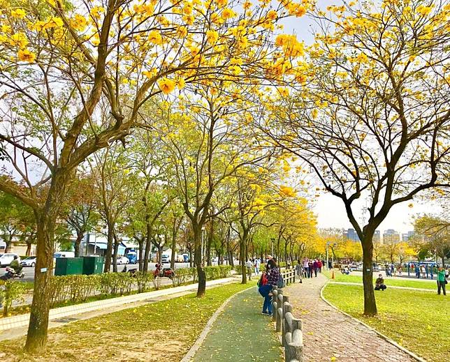 位在台中北屯的廍子公園佔地約5公頃,每年的3月初就是黃花風鈴木的花季,花期約為2至3週,將近20棵的花樹一次爆炸式盛開,從太順路、情人橋旁景賢路宛如黃金大道,一路延伸至廍子公園,包圍著四周人行道與綠地,一片金黃色的燦爛就像座黃金城一樣。