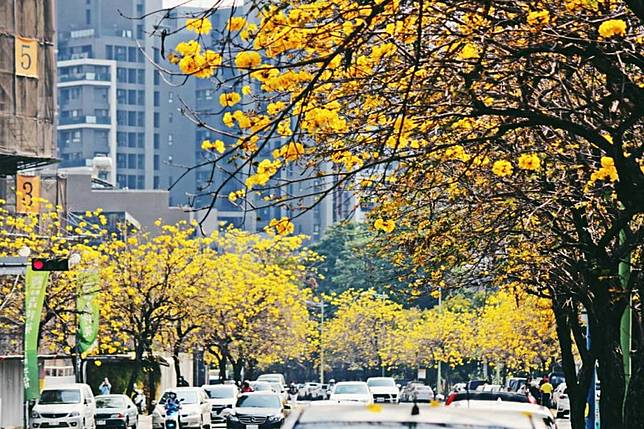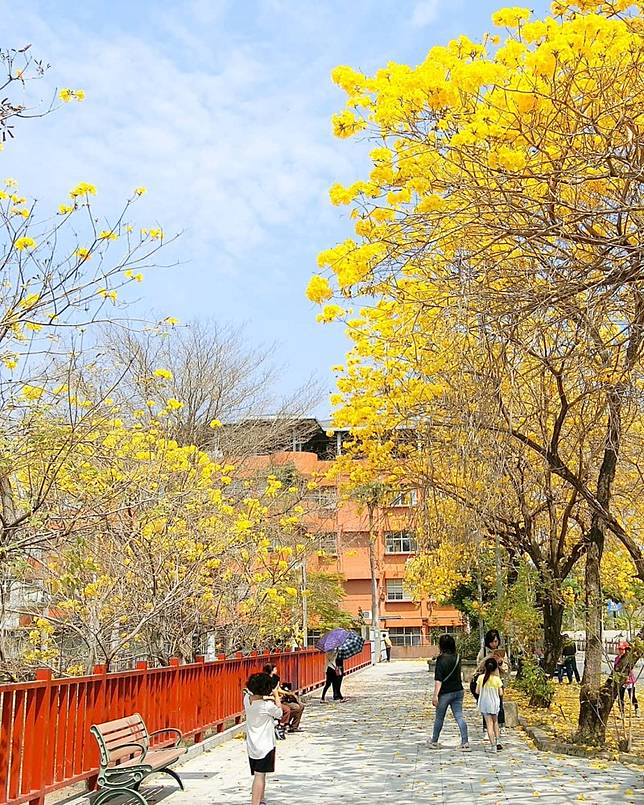 位在台中北屯區的太順路也下起了黃金雨,賞花範圍從太順路靠近廍興公園的地方,一直到翔順路都開著滿滿的黃花,綿延1公里長的黃金大道金光閃閃相當耀眼,而來太順路賞花後還可以順道至大坑情人橋或是來大坑步道爬山踏青。
