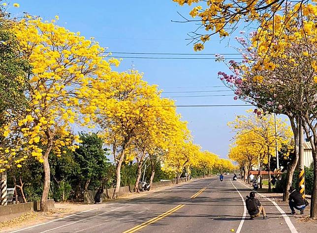 位在嘉義的台林橋附近河堤的黃花風鈴木正值花期,往秀林村方向的台林橋河堤旁黃花風鈴木綿延約1公里左右,金黃色的黃花風鈴木炸開,近距離拍攝超壯觀,但也要提醒想來拍美照的民眾,此處的黃花風鈴木位在河堤旁,斜坡高低落差大,拍照時一定要多加注意自身安全。