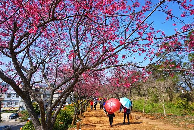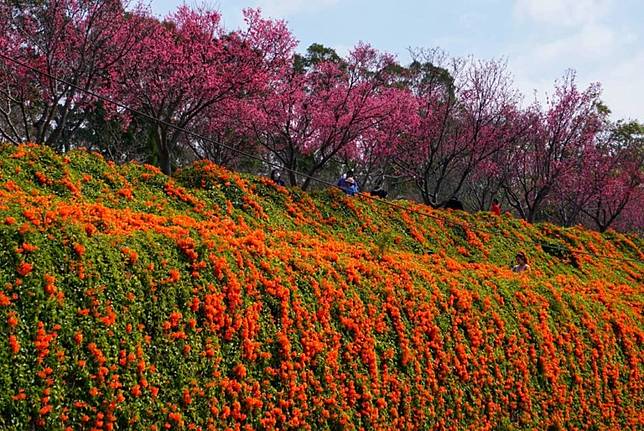 而炮仗花的花期一般落在一月到三月,二月是炮仗花最繁茂的時節,現在去不但有「炮仗花瀑布」可以欣賞,還能一邊賞櫻花。沒錯!銅鑼環保公園也有種植多棵櫻花樹,在春季綻放時與炮仗花一同入鏡,是熱愛攝影者最棒的禮物。