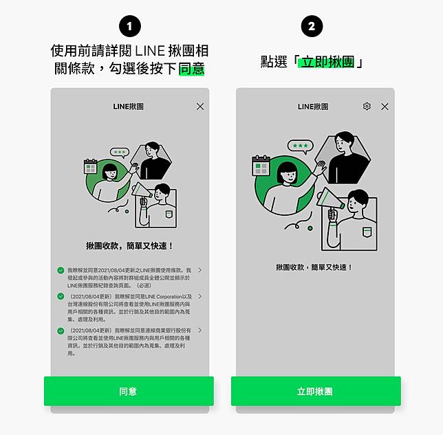 2. ▼ 若該群組未使用過揪團,使用前請詳閱LINE揪團相關條款,勾選後按下「同意」,再點擊「立即揪團」,即可開始建立團購資訊。點擊「確定揪團」,並按下「確定」送出開團訊息,團長即可獲得 LINE POINTS 1點,活動期間最多可參與一次(單日限額1萬點,總限額5萬點)