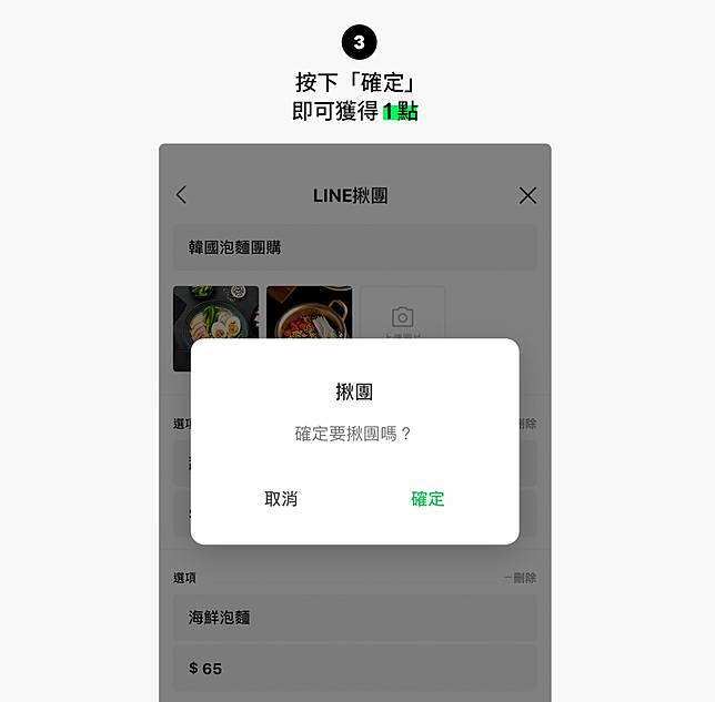 3. ▼ 若該群組使用過揪團,點擊揪團列表畫面右下方的「+」即可建立新的團購資訊。點擊「確定揪團」,並按下「確定」送出開團訊息,團長即可獲得 LINE POINTS 1點,活動期間最多可參與一次(單日限額1萬點,總限額5萬點)