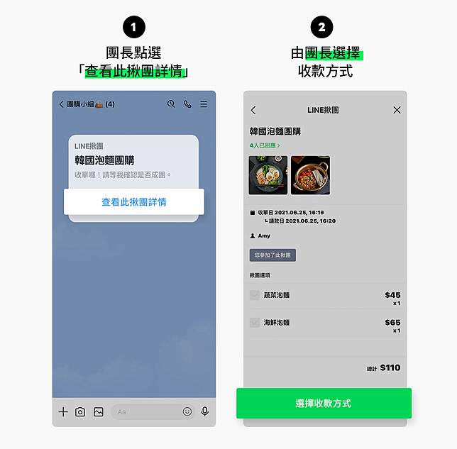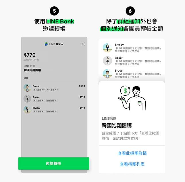 1. 揪團收單後,由團長點擊揪團查看詳情,選擇收款方式(LINE Pay Money或 LINE Bank擇一),並對團員發出轉帳邀請。