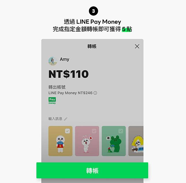 2. 團員收到團長發出的轉帳邀請後,依照團長指定的付款方式完成轉帳且金額達新台幣十元以上,團員即可於一定時間獲得LINE POINTS 5點(請參考下方「五、點數任務注意事項」之規範)。活動期間團員可參與LINE Pay Money與 LINE Bank兩種付款方式各一次,最多共可獲得LINE POINTS點數10點(LINE Pay Money 與 LINE Bank 各提供13萬點總限額)。
