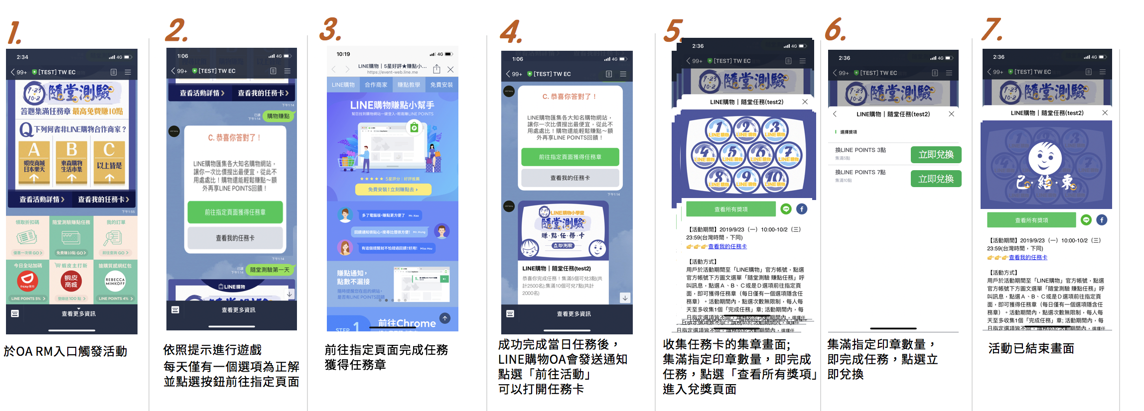 用戶於活動期間至「LINE購物」官方帳號,點選官方帳號下方圖文選單「隨堂測驗 賺點任務」呼叫訊息,點選A、B或是C選項前往指定頁面,即可獲得任務章(每日僅有一個選項隱含任務章)。活動期間內,點選次數無限制,每人每天至多收集1個「完成任務」章; 活動期間內,每日指定選項皆不同,請務必於活動期間內,選擇任5日自「LINE購物」官方帳號至指定頁面完成累積5個「完成任務」章,即可兌換第一階段獎勵LINE POINTS 3點; 持續再累積5日自「LINE購物」官方帳號至指定頁面再完成累積5個「完成任務」章,即可再兌換第二階段獎勵LINE POINTS 7點(共計10個「完成任務」章)。單一LINE帳號最多僅可得ㄧ張賺點任務卡,且最高能獲得一次LINE POINTS 10點獎勵,參與活動請務必先行同意使用者同意條款及活動相關注意事項。