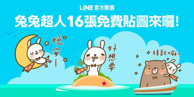 LINE官方嚴選|兔兔超人 免費貼圖下載★ 點我免費下載◆下載期限:2021/8/10 11:00 ~ 2021/9/8 22:59◆下載條件:於下載期限內加入LINE官方嚴選官方帳號,即可免費下載貼圖!